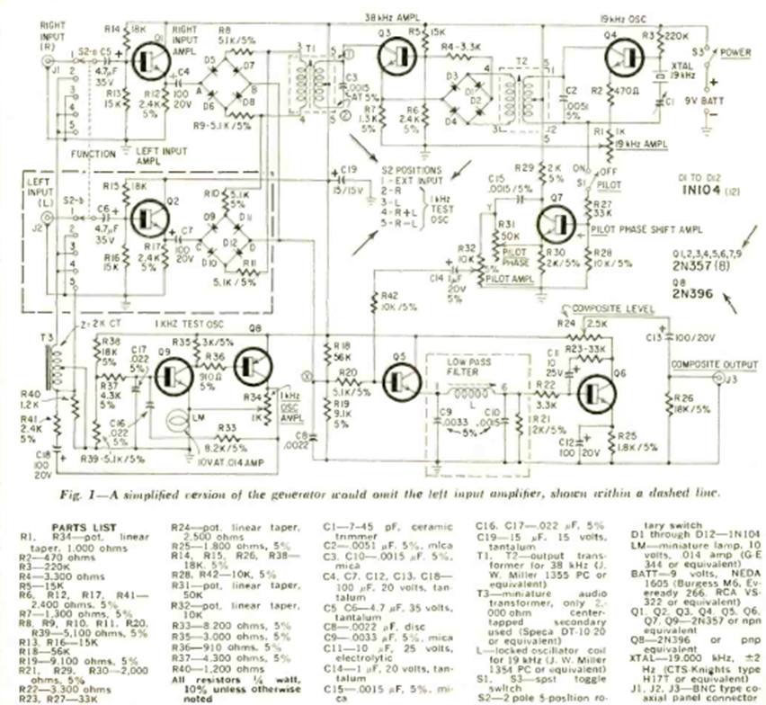 Este circuito fue encontrado en la revista Radio Electronics de julio de 1967. Genera señales para sintonizar receptores de FM estéreo y está completamente transistorizado. El circuito fue publicado en un artículo que describe su montaje.