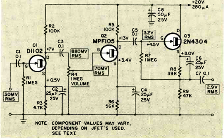 Este circuito con JFET lo encontramos en una revista de Radio Electronics de junio de 1969. El montaje del circuito está descrito en un artículo completo. Se pueden utilizar transistores equivalentes.