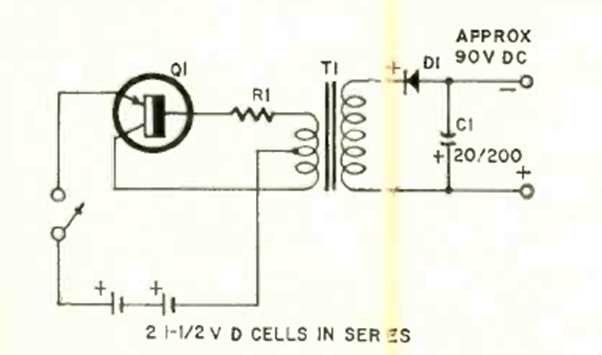 Este circuito tiene como objetivo reemplazar una batería de 90 V utilizada en radios de válvulas antiguas. El circuito utiliza un transformador con el voltaje adecuado y el transistor puede alimentar a cualquiera. La resistencia R1 tiene valores entre 470 ohms y 4k7 dependiendo de la ganancia del transistor.