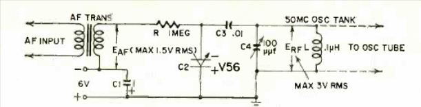 En este Radio Electronics de mayo de 1958 tenemos el uso ya común del varicap en un circuito modulador de frecuencia. El circuito utiliza un transformador para el acoplamiento.