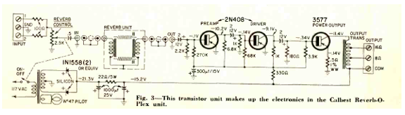 Este efecto de reverberación fue encontrado en la revista Radio Electronics de diciembre de 1961. Hace uso de resortes e incluye la fuente de alimentación y el amplificador de potencia.