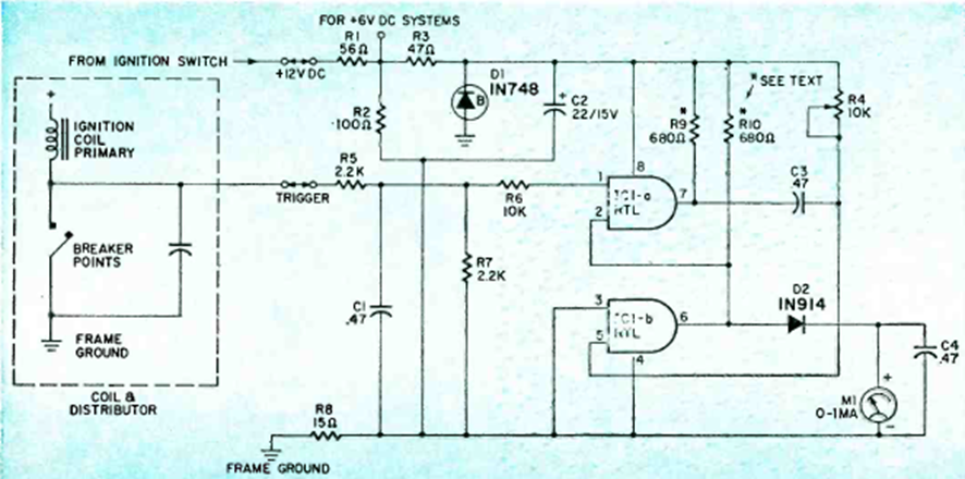 Este circuito de una revista de Radio Electronics de junio de 1969 ya muestra el uso de la tecnología TTL recientemente lanzada. El circuito es un tacómetro con instrumento analógico para coches con chapa.