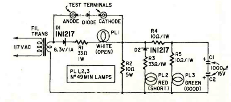 Encontramos este circuito de prueba en la revista Radio Electronics de julio de 1962. El circuito utiliza lámparas indicadoras según la corriente de prueba de los diodos.