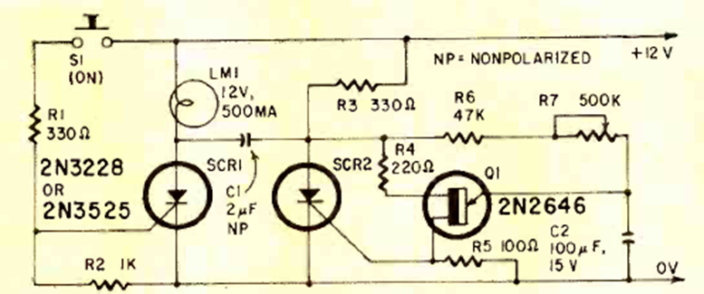 Este circuito con SCR y uniunión lo encontramos en una revista de Radio Electronics de junio de 1969. Los SCR deben estar de acuerdo con la lámpara incandescente controlada. El circuito está alimentado por tensión continua.