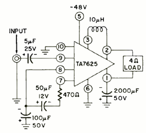 Es el mismo circuito amplificador que el circuito anterior adaptado para funcionar con una fuente simple. El circuito es de la misma revista Radio Electronics de octubre de 1969.