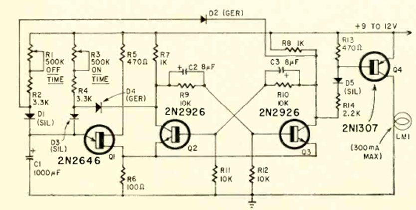 Este intermitente para lámparas incandescentes se encontró en la revista Radio Electronics de julio de 1968. La frecuencia y duración de los impulsos se ajustan en R1 y R3 dependiendo también de C1.