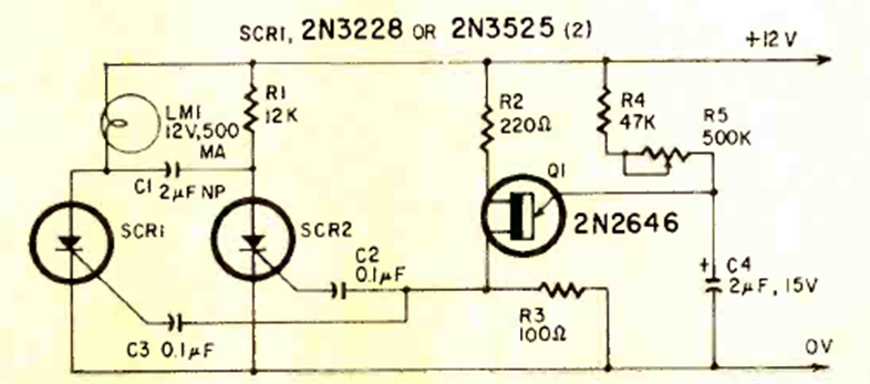 Esta configuración tradicional de intermitente o intermitencia la encontramos en una revista de Radio Electronics de junio de 1969. Los SCR son según la potencia de la lámpara controlada.