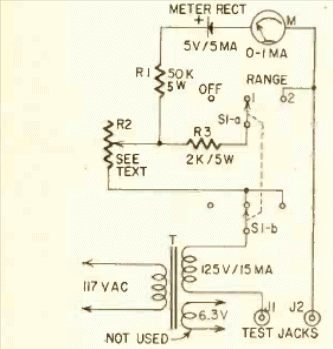 Este sencillo instrumento para medir capacitancias y resistencia se encontró en la revista Radio Electronics de septiembre de 1958. Utiliza un instrumento analógico de 1 mA a escala completa.