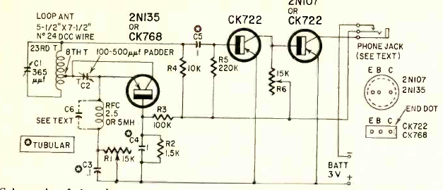 Este receptor sensible para el rango de onda media se encontró en la revista Radio Electronics de diciembre de 1960. El circuito tiene una salida para auriculares y se alimenta con sólo 3 V.