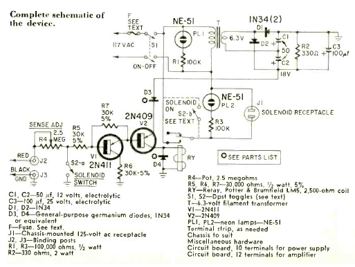 Este sensor se publicó en la revista Radio Electronics en abril de 1962. El circuito de dos transistores acciona un relé basado en señales de un sensor de contacto.
