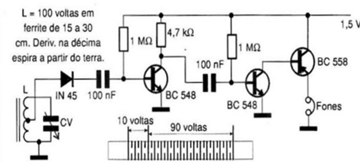 El circuito presentado es un receptor para la banda de onda media. Una vez más, los componentes son todos comunes: la bobina consta de 100 vueltas de alambre muy fino, enrolladas en una varilla de ferrita que mide entre 10 y 30 cm, con un casquillo en su décima vuelta. Observe cuidadosamente las conexiones del condensador variable y de la bobina en el circuito. Las pruebas se pueden realizar moviendo la toma del cable hacia arriba, para mejorar la sensibilidad, sin embargo, esto empeora la selectividad, pero se puede realizar según las necesidades del lector. Si es necesario, es posible añadir una antena, utilizando un capacitor de aproximadamente 10 a 100 pF en la centésima vuelta de la bobina, es decir, en el lado opuesto a tierra. En este circuito el cable de tierra no es necesario, pero en determinados casos mejora la recepción. Se pueden utilizar unos auriculares o incluso un pequeño altavoz, según el caso. El diodo de germanio acepta varios equivalentes.