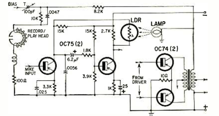 Este control automático para registrar el nivel de la señal se encontró en una Radio Electrónica de septiembre de 1966. Los transistores son de la época. El principio del optoacoplador se puede adaptar a aplicaciones más modernas.