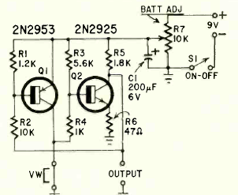 Un oscilador ligeramente diferente del anterior también apareció en la revista Radio Electronics en mayo de 1968. El circuito utiliza una fuente de corriente para alimentar el cable que vibra entre los polos de un imán.