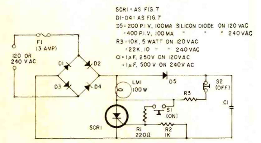 Este circuito para la red eléctrica fue encontrado en la revista Radio Electronics de junio de 1969. El SCR y los diodos son según la potencia de la carga controlada.