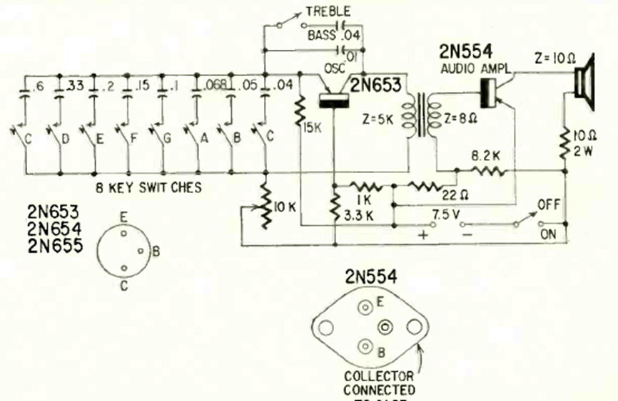 Encontramos este sencillo circuito de órgano de juguete en la revista Radio Electronics de febrero de 1968. Los transistores eran comunes en esa época y el transformador es una salida de radio de transistores.