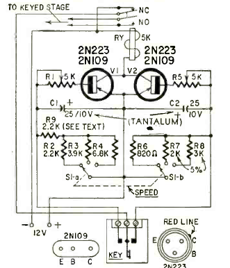 Este circuito de dos transistores para activar un relé en un manipulador de telégrafo se encontró en la revista Radio Electronics del año 1962. El circuito utiliza transistores de la época.