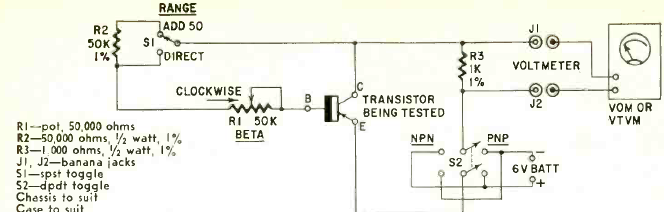 Este circuito lo encontramos en la revista Radio Electronics de enero de 1961. Con él es posible medir la ganancia de los transistores utilizando un multímetro común.