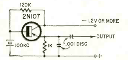 Utilizando el conocido 2N107, uno de los primeros transistores comerciales, este circuito produce una señal de 100 kHz según el cristal. La alimentación se puede suministrar con tensiones a partir de 1,2 V. Se pueden utilizar transistores equivalentes.