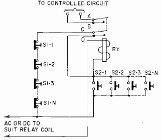 La figura muestra cómo obtener un relé de bloqueo para un circuito de alarma con sensores en serie y en paralelo. El número de sensores que se pueden utilizar es ilimitado.