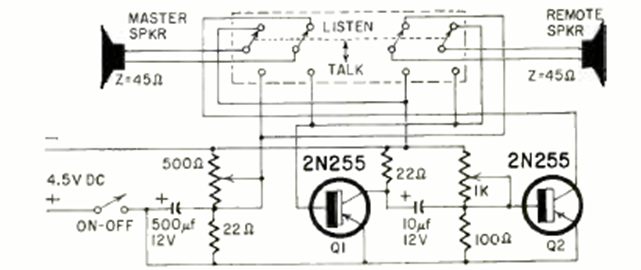Este sencillo circuito utiliza los altavoces como micrófonos. El circuito de dos estaciones se puede ampliar a más. Fue encontrado en una Radio Electronics de julio de 1963. La distancia máxima depende de las pérdidas en cables que no necesitan ser blindados.
