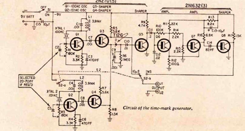 Este es un circuito antiguo con una característica que tienen la mayoría de los osciloscopios modernos. Lo encontramos en una Radio Electrónica de abril de 1965. El circuito genera señales de frecuencias conocidas para servir como referencia en un osciloscopio.