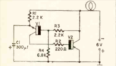 Este circuito de bajo consumo para pequeñas bombillas basado en transistores se encontró en la revista Radio Electronics de enero de 1959. La alimentación es de 6 V.