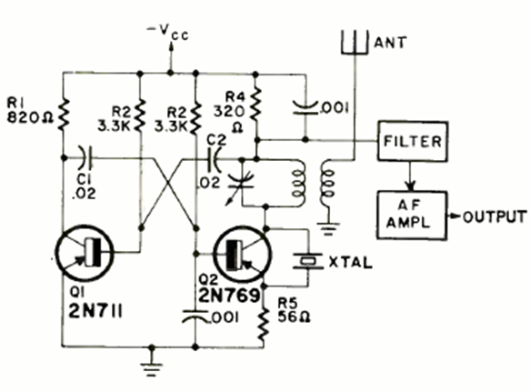 Este interesante detector de dos transistores se caracteriza por una alta selectividad. El circuito es de una revista de Radio Electronics de octubre de 1969. La frecuencia depende de la bobina y del capacitor variable. Además del cristal.