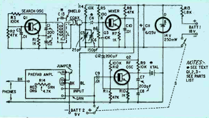 Este circuito fue encontrado en la revista Radio Electronics de julio de 1966. Las bobinas de búsqueda son del tipo utilizado convencionalmente en este tipo de circuito y deben ser resonantes en la frecuencia del oscilador.