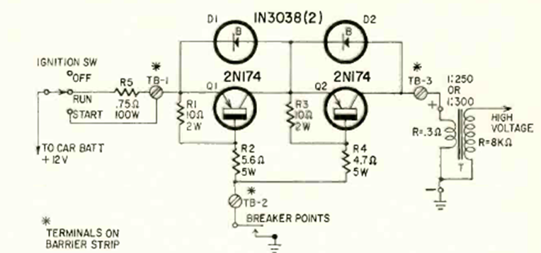 Este circuito es de una Radio Electronics de abril de 1964. El circuito utiliza transistores de potencia de la época, que deben montarse en un buen radiador de calor. Se pueden utilizar equivalentes modernos.