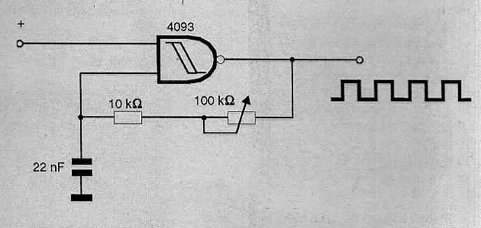 Este oscilador produce una señal rectangular en el rango de 100 Hz a 1 kHz, pero cambiando el condensador podemos obtener otros rangos de frecuencia. El ajuste fino de la frecuencia se realiza con el potenciómetro de 100 k ohms. En este circuito sólo se utiliza una de las cuatro puertas del 4093. La alimentación positiva de 3 a 15 V se realiza en el pin 7 y la masa en el pin 14.
