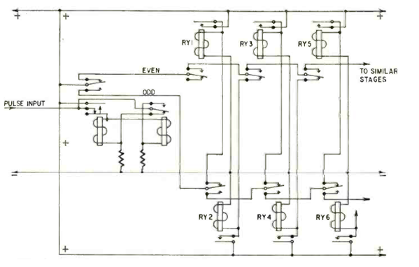 Este interesante contador digital con relés con salidas complementarias fue encontrado en la revista Radio Electrónica de Octubre de 1961. La tensión de alimentación es acorde a los relés utilizados.