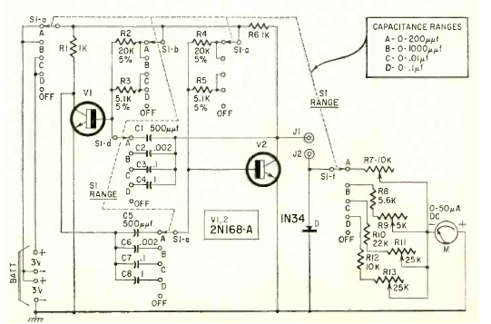 Se trata de una versión completa del circuito anterior, con varias escalas y dos transistores, uno de los cuales se utiliza para amplificar la señal generada para obtener mayor sensibilidad. El circuito es de una Radio Electronics de junio de 1961.