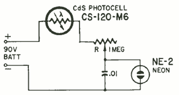 Este circuito con LDR y lámpara de neón tiene su frecuencia de funcionamiento dada por la luz. El circuito es de una Radio Electrónica de julio de 1963. Puede usarse con fines didácticos o experimentales. C1 se puede cambiar según la frecuencia deseada.