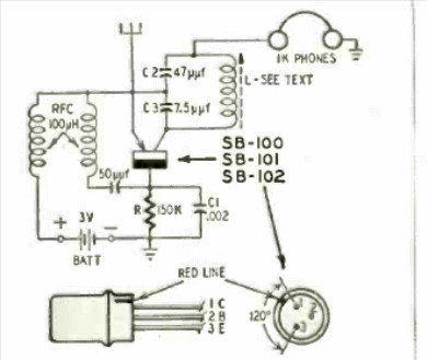 Este receptor de onda media y corta fue encontrado en la revista Radio Electronics de enero de 1958. El circuito funciona con baterías y tiene una salida de auriculares de alta impedancia.