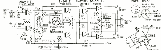 Este amplificador se publicó en la revista Radio Electronics en septiembre de 1959. El circuito de 8 transistores no utiliza un transformador de salida y se alimenta con una tensión de 13 a 15 V.