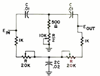 Este filtro fue encontrado en la revista Radio Electronics de octubre de 1969. La frecuencia depende de los capacitores y de los ajustes de los tres potenciómetros, con un valor central en torno a 1 kHz.