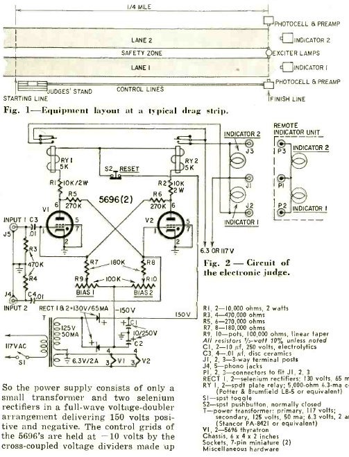 Este circuito utiliza sensores para determinar qué coche cruza primero la línea de meta. El circuito fue encontrado en la revista Radio Electronics de enero de 1961 en un artículo que enseña cómo montarlo.