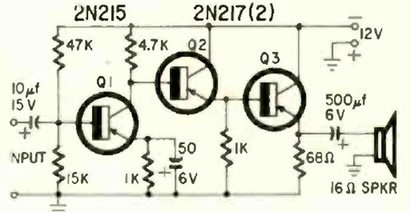 Este circuito de altavoz sin transformador de 16 ohms se encontró en una Radio Electronics de octubre de 1963. El circuito funciona con 12 V y la ganancia es de 50 dB.