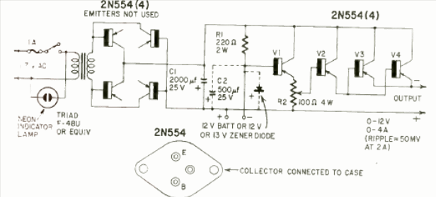 Utilizando transistores de potencia de la época, esta fuente fue publicada en la revista Radio Electronics de abril de 1959. La fuente de 4 A tiene una tensión de 12 a 13 V en su máximo.