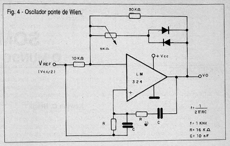 Este circuito produce una señal sinusoidal cuya frecuencia se puede calcular utilizando la fórmula del diagrama. Junto a esta fórmula tenemos los valores calculados para una frecuencia de 1 kHz. La fuente de alimentación no necesita ser simétrica, pero su tensión influye en la distorsión de la forma de onda generada, dando preferencia a valores entre 12 y 15 V. El ajuste de la simetría de la forma de onda y su fidelidad se realiza en el trimpot. La tensión de referencia se puede obtener a través de un divisor con dos resistores de 10k ohms en serie.