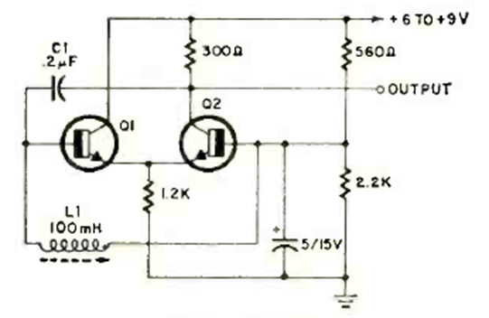 Este circuito oscilador LC con transistores acoplados a emisor se encontró en la revista Radio Electronics de mayo de 1970. La frecuencia está determinada por L1 y C1 y el valor máximo depende de los transistores utilizados.
