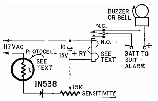 Este circuito fue encontrado en la revista Radio Electronics de febrero de 1962. El sensor es un LDR y la energía proviene directamente de la red eléctrica.