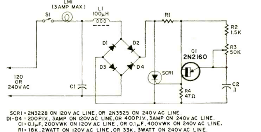 Este circuito fue encontrado en la revista Radio Electronics de julio de 1969. El circuito controla cargas resistivas y motores universales con potencia según el SCR utilizado.