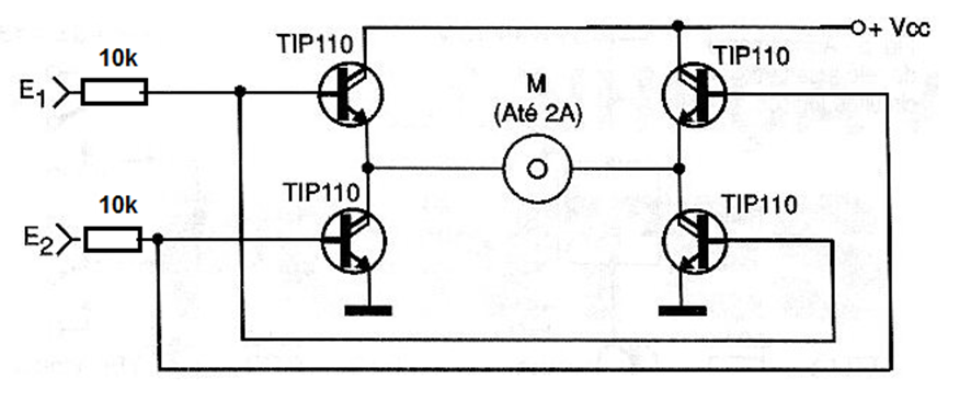 A continuación, se muestra un puente con mayor sensibilidad y, por tanto, menor consumo para las salidas del microcontrolador, haciendo uso de transistores Darlington. Este puente tiene 4 estados posibles, 00 para el motor parado, 01 y 10 para ambos sentidos de rotación y el estado prohibido 11 que lleva a todos los transistores a conducción y por tanto a una situación de cortocircuito. Los transistores deben estar equipados con disipadores de calor. La alimentación independiente para los motores puede oscilar entre 3 y 15 V.