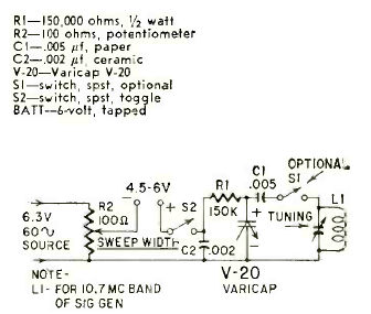 Este circuito para sintonizar receptores de FM se encontró en la revista Radio Electronics de noviembre de 1960. El circuito utiliza la frecuencia de la red eléctrica de 60 Hz para el barrido.
