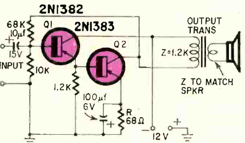 Este circuito acoplado directo opera en clase AB con buena ganancia. El circuito está alimentado por 12 V. Lo encontramos en una Radio Electronics de octubre de 1963.