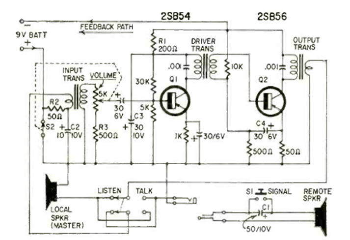 Este circuito de intercomunicación cableado se encontró en Radio Electronics de marzo de 1965. El circuito utiliza dos transistores y la distancia máxima entre estaciones depende de la pérdida en los cables. No es necesario apantallar los cables.