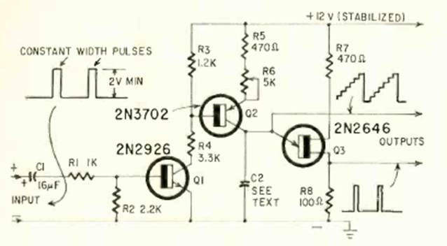 Este circuito divisor de frecuencia que genera una señal en forma de escalera se encontró en la revista Radio Electronics de junio de 1968. Se debe considerar la frecuencia de la señal de entrada al elegir C2.