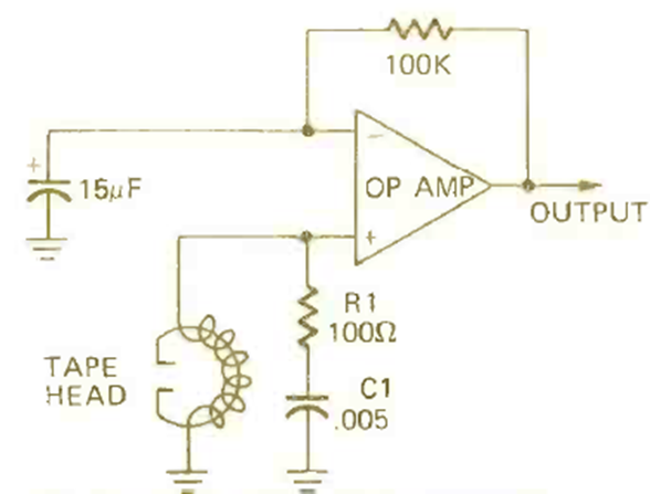 En la figura vemos cómo utilizar un amplificador operacional con un cabezal de baja impedancia. La ganancia viene dada por la resistencia de 100 k. El circuito es de una Radio Electronics de diciembre de 1972.