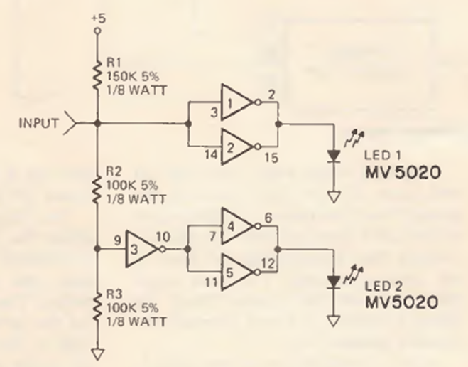 Encontramos este sencillo circuito en la revista Radio Electronics de diciembre de 1975. El circuito integrado es el 4009 CMOS y el circuito funciona tanto en TTL como en CMOS dependiendo de la fuente de alimentación.